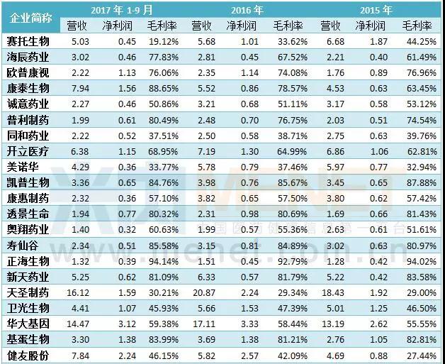 在這41家上市的醫藥企業中,大參林最會賺錢,近年營收保持兩位數增長;毛利率方面,海特生物、正海生物、艾德生物均超90%;市值最高的是國內基因檢測行業的龍頭企業華大基因,曾一度沖破千億市值。